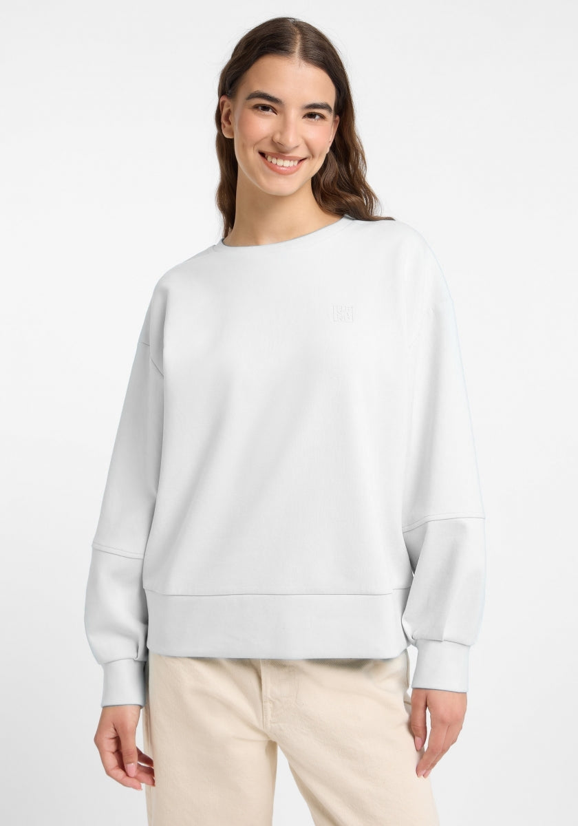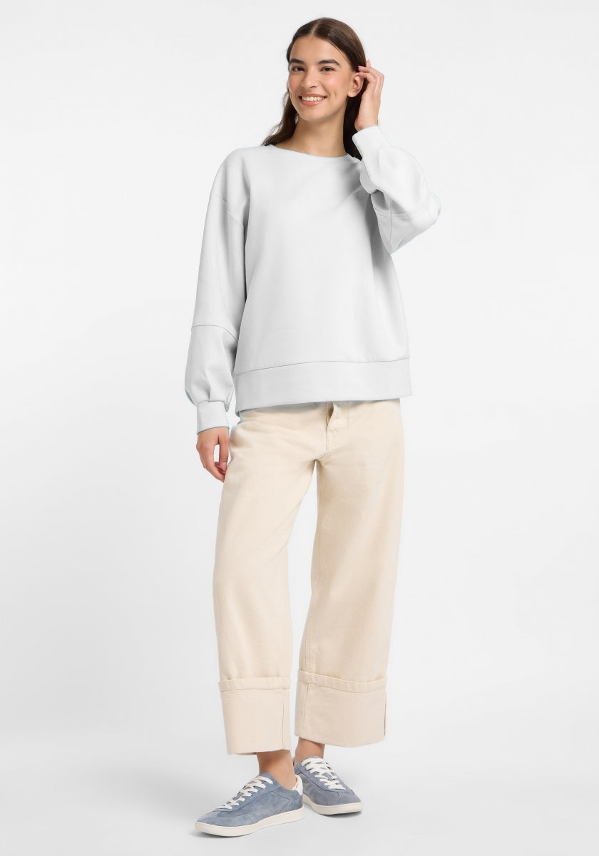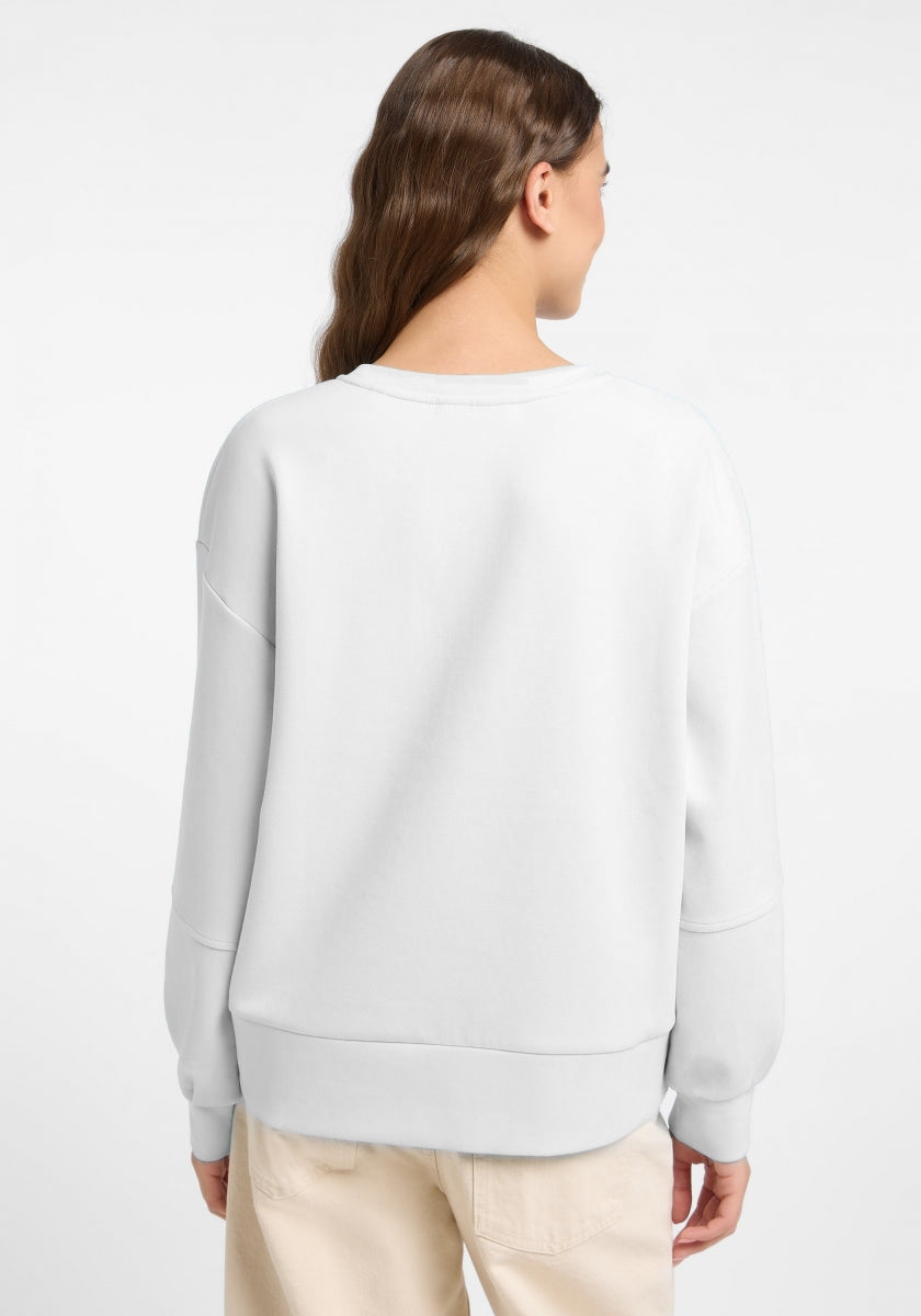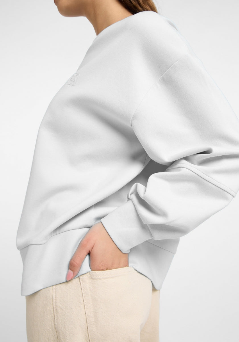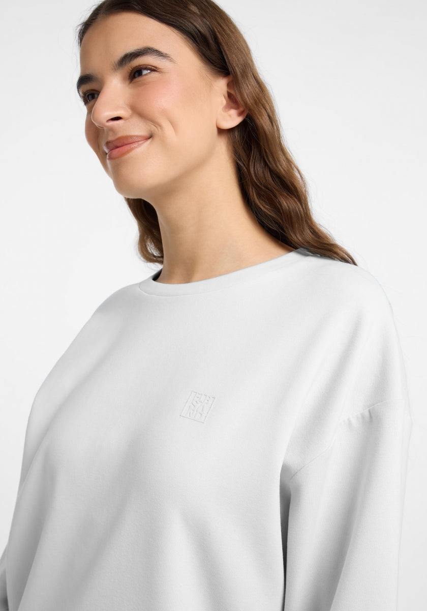 Our Elbsand Geske Sweatshirt features a loose and comfortable fit made from soft interlock sweatshirt fabric. It has a crew neckline, dropped shoulders, cuffed sleeves, and built-in pleats. A subtle, slightly glossy rubber print on the front gives the shirt a high-quality, understated look. This sweatshirt combines comfort and style for everyday wear, perfect for walks, the office, or after work. Made from 82% organic cotton, 14% polyester, and 4% elastane, it is machine washable at 30 degrees on a gentle cycle and not suitable for tumble drying.