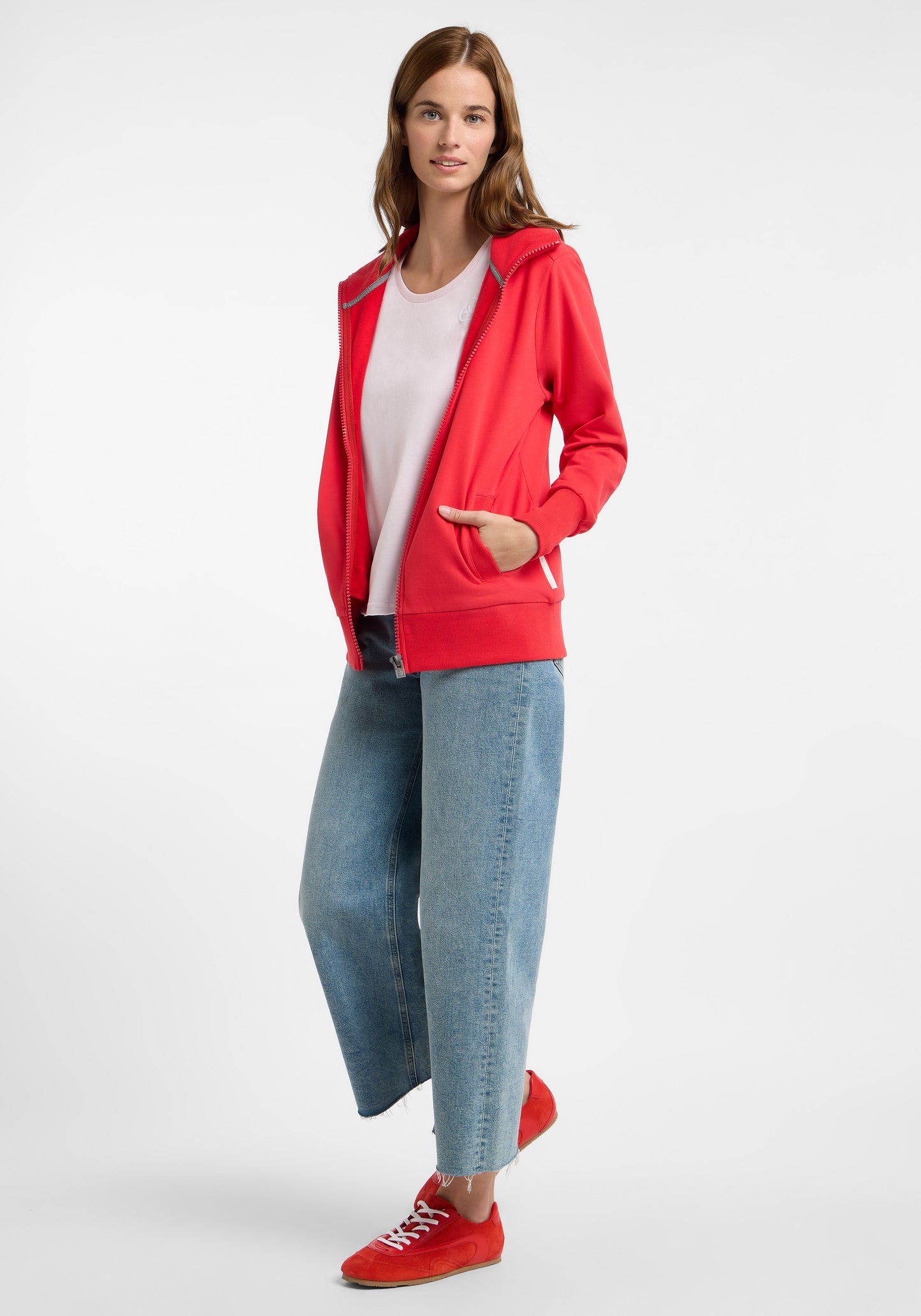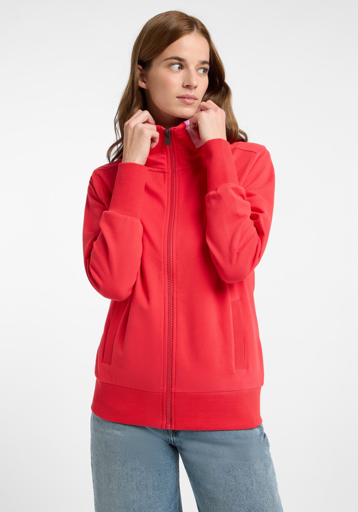 The Elbsand Alvis Sweat Jacket is a regular fit zip-up jacket featuring a high stand-up collar, made from soft, stretchy sweat fabric (95% cotton, 5% elastane). The inside is cozy brushed, providing a comfortable wear and warmth. The jacket is distinguished by practical welt pockets, straight cuff finishes, a soft flock print on the collar, and a subtle logo badge on the side seam. It is versatile, perfect for everyday wear, leisure activities, or cool summer evenings. Care instructions: Machine wash at 30°C on a gentle cycle, do not tumble dry.