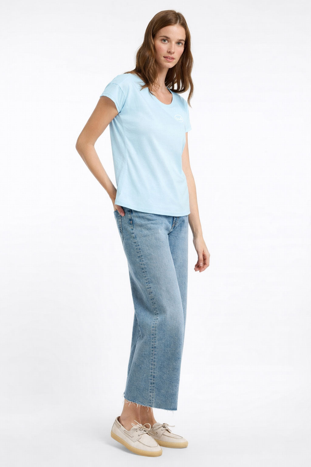 The Elbsand Ragne T-Shirt features a regular fit cut made from lightweight single jersey fabric with a soft touch. It impresses with a classic round neckline and raw-edge hems for a casual, urban look. A soft flock print on the chest and at the nape adds subtle accents. The composition of 50% cotton and 50% polyester ensures comfortable wear. This sporty T-shirt is versatile and ideal for everyday wear, relaxed hours at the beach, or city trips. Care instructions: Machine wash at 30 degrees, gentle cycle, do not tumble dry.