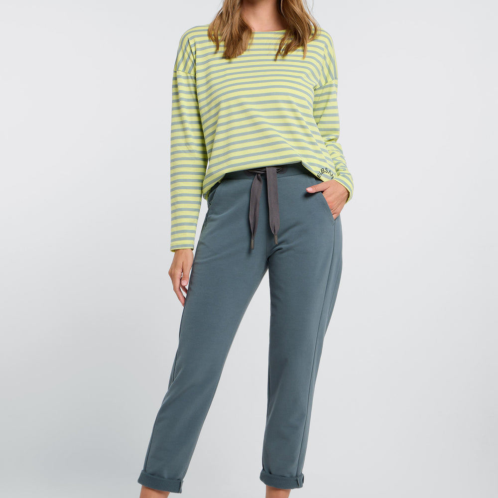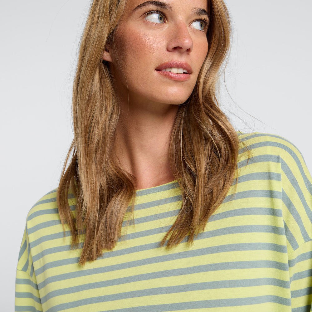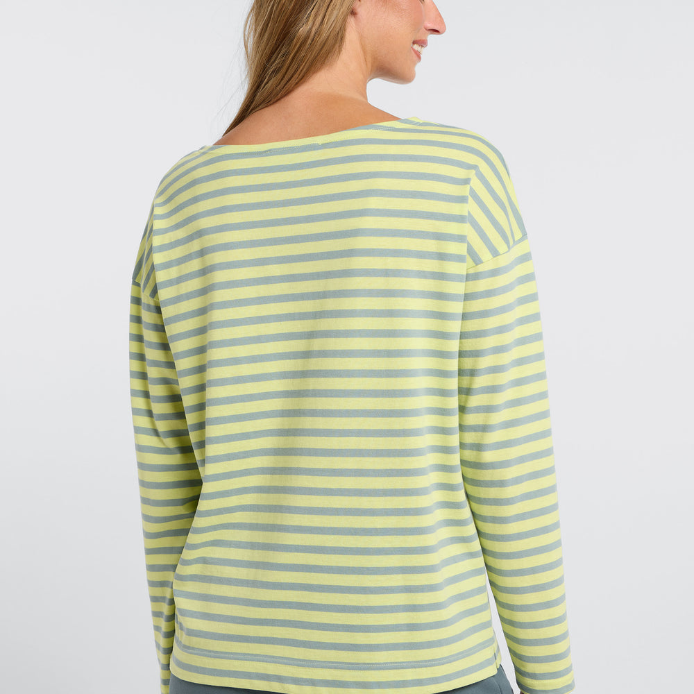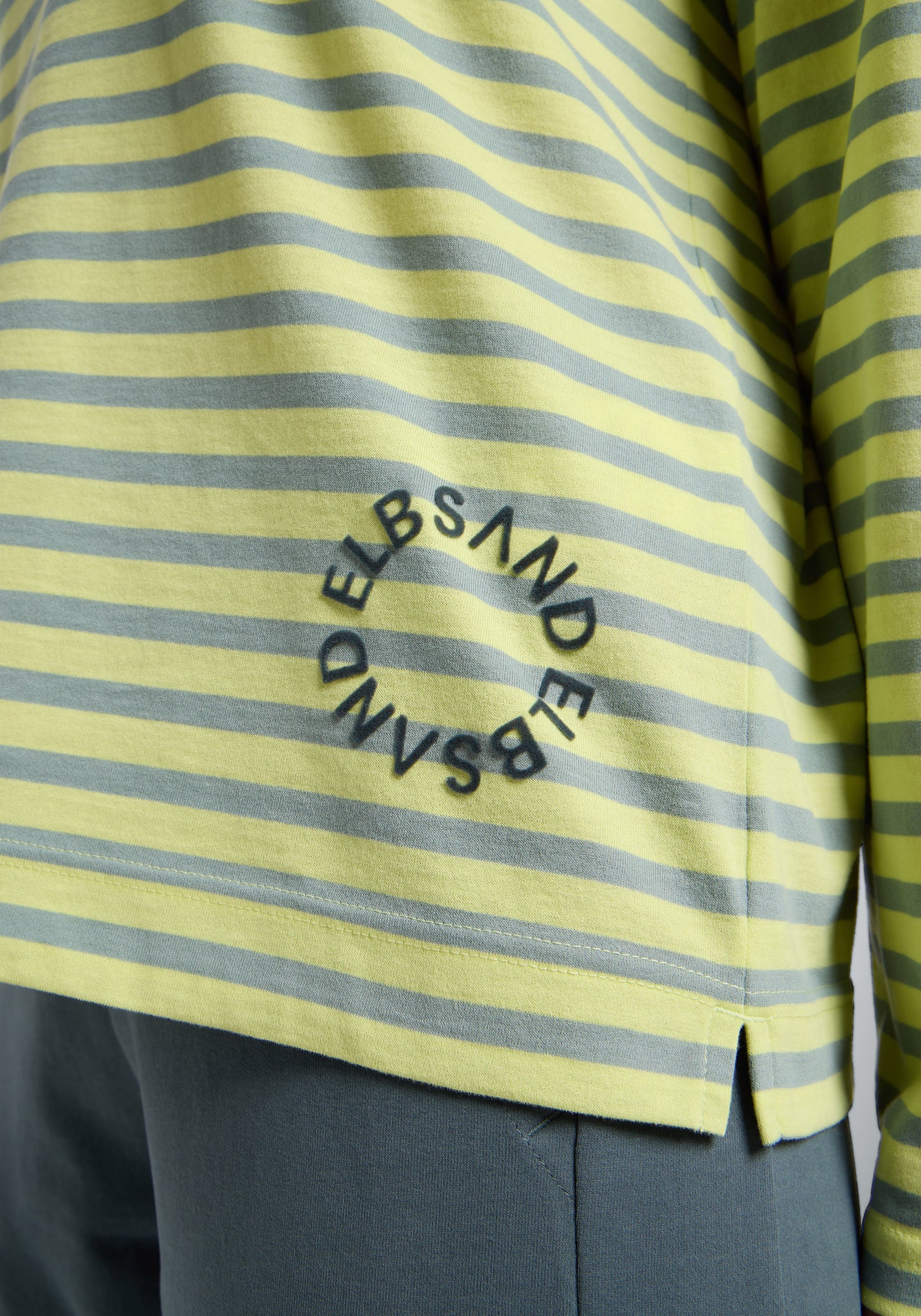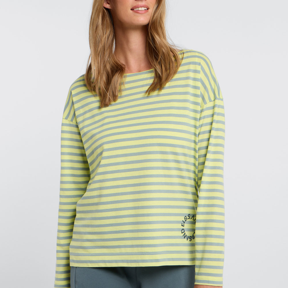 The boat neckline adds a feminine touch to the look and pairs perfectly with necklaces or scarves. A soft flock print on the front adds subtle accents that highlight the signature Elbsand style. Whether worn with jeans, shorts, or jog pants – this striped long sleeve always works.