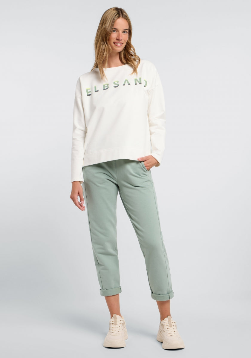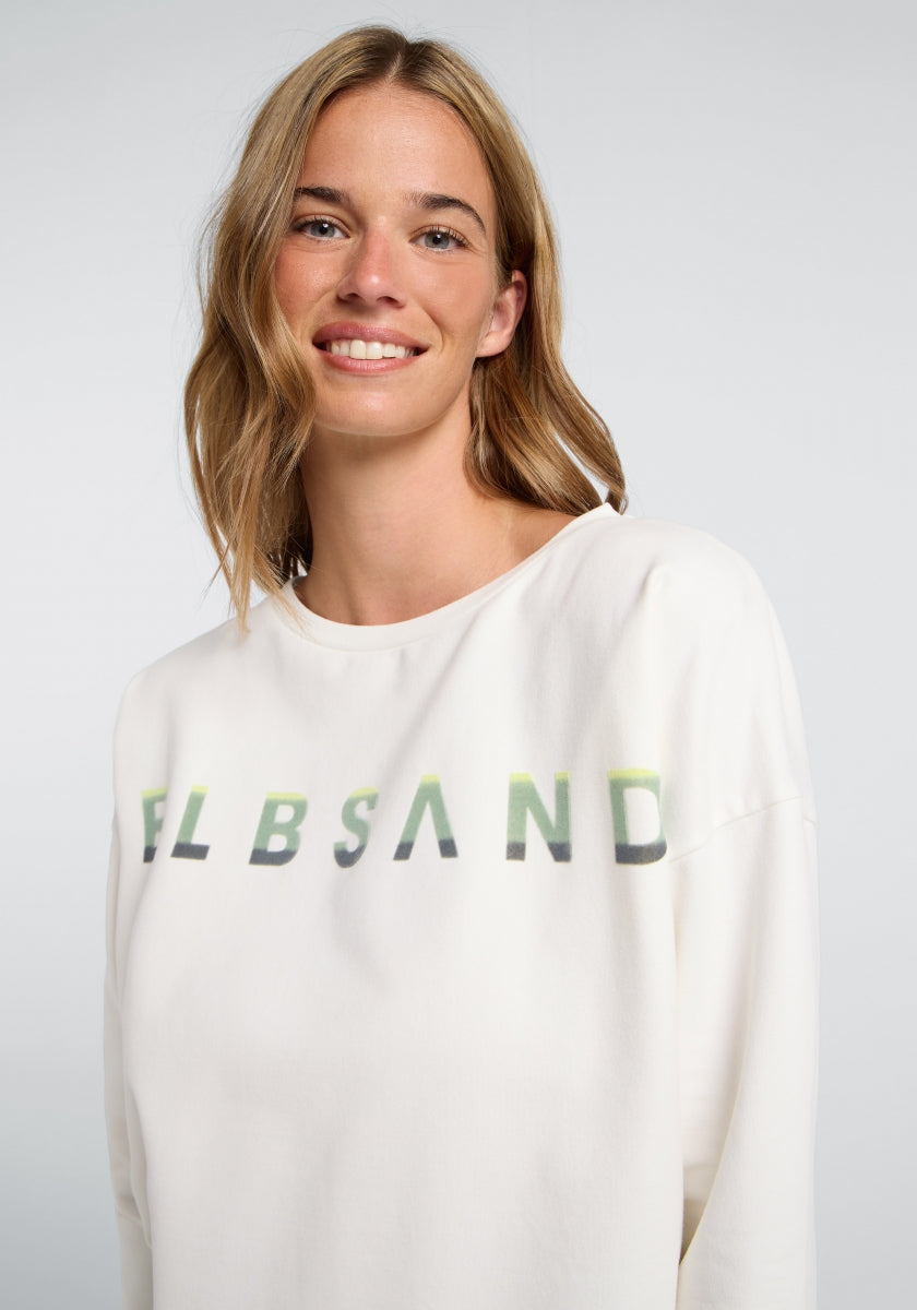 Our Elbsand Alvar Sweatshirt is a loose-fitting, comfortable sweatshirt for women. Made from 95% cotton and 5% elastane, it offers a soft, stretchy sweat fabric with a cozy brushed and raised interior for a pleasant wearing experience. The sweatshirt features a wide neckline, slightly dropped shoulders, and a broad hem with side slits, giving it a sporty yet feminine look. A soft gradient flock print on the front adds a modern, stylish accent. This sweatshirt is perfect for relaxing days, walks, or meeting friends and pairs well with jeans or joggers for versatile wear. Care instructions: Machine wash at 30 degrees Celsius on a gentle cycle, do not tumble dry.