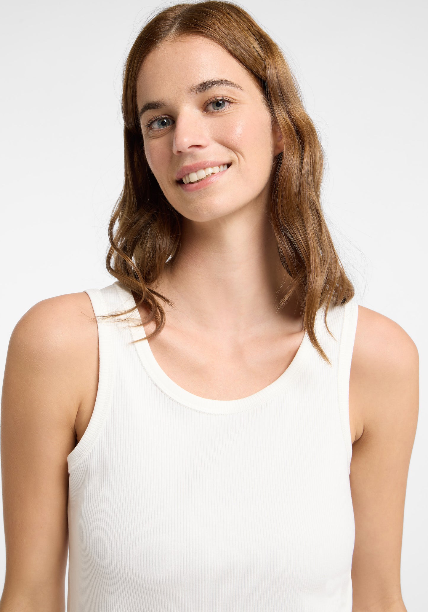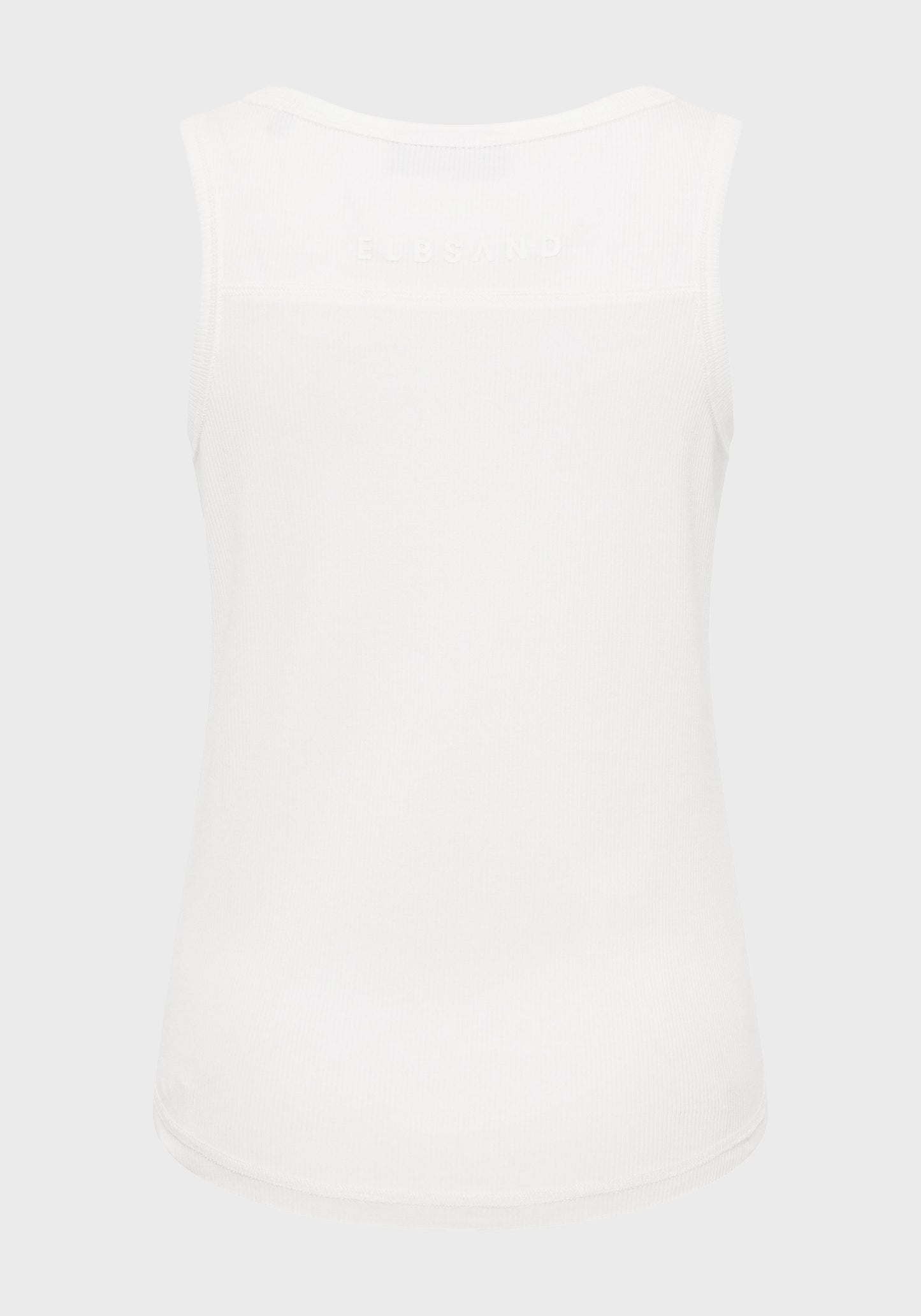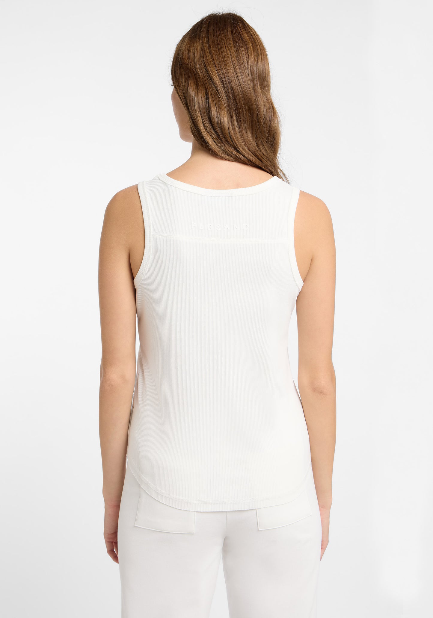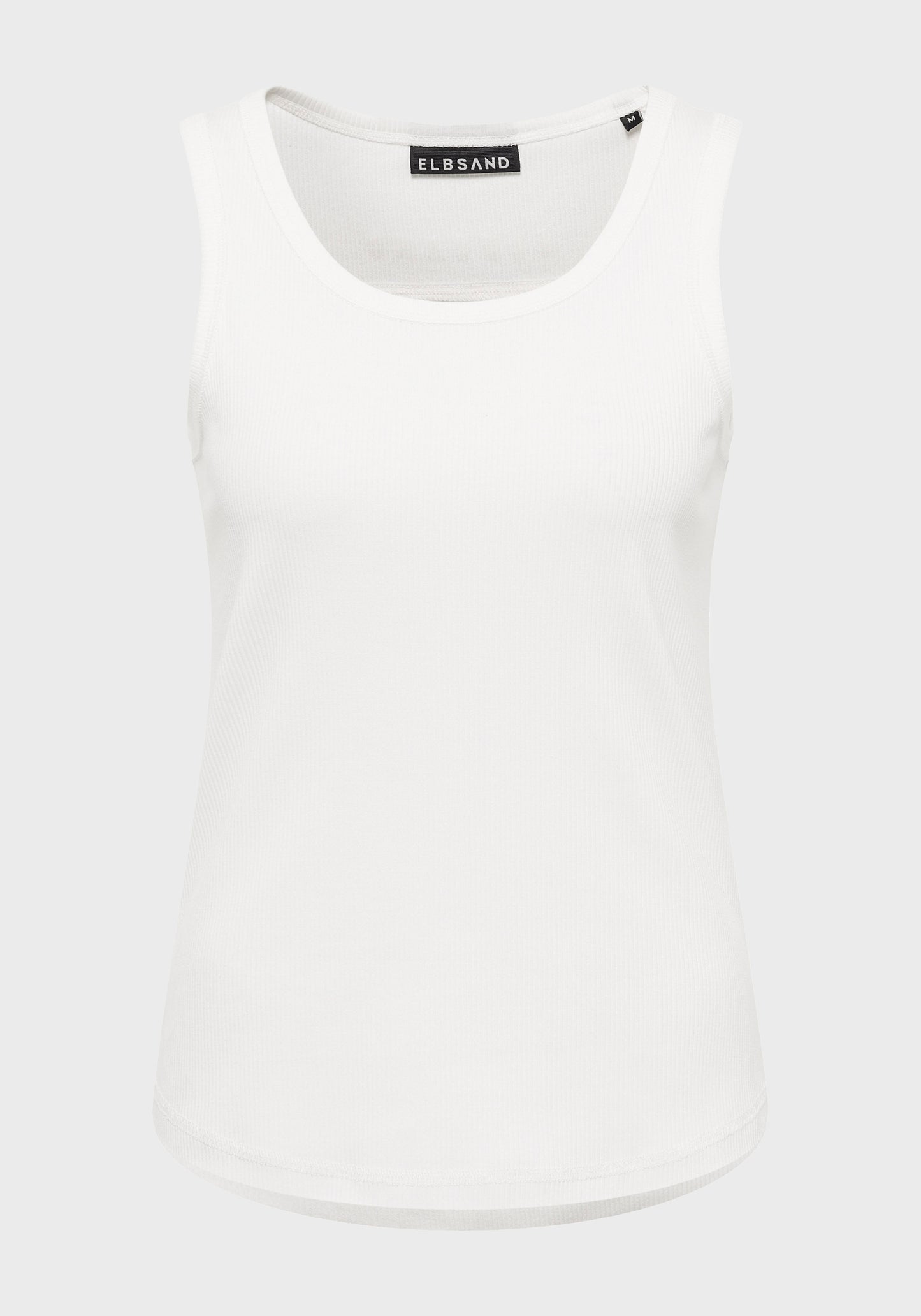 The Elbsand Jara Top is a regular fit tank top made from soft rib jersey, offering a comfortable feel against the skin while maintaining its shape. It features a classic round neckline and a subtle, soft logo print on the back, adding a refined brand touch to this high-quality basic top. Versatile and easy to style, this top is perfect for everyday wear—whether layered under a blouse, paired with joggers, or worn solo on warm days. Composition: 50% modal, 46% cotton, 4% elastane. Care instructions: Machine wash at 30°C on a gentle cycle, not suitable for tumble drying.