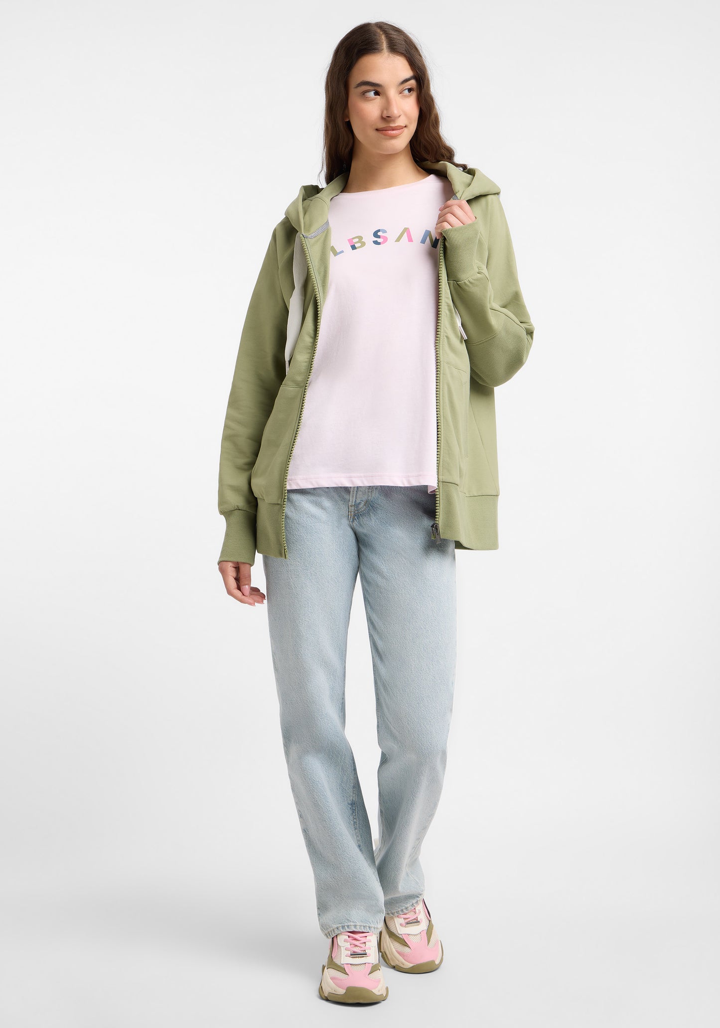 Our Elbsand Kelda Zip Jacket is a regular fit sweatshirt made from soft, stretchy sweatshirt fabric with a cozy brushed interior. It features a roomy hood with drawstring, a kangaroo pocket, and a soft embroidery on the hood. This sporty hooded jacket offers a high comfort level and is the perfect companion for relaxed but stylish looks. The jacket is comfortable due to its regular cut and especially pleasant thanks to the soft, elastic material quality. Ideal for walks, sports, or relaxing days at home. Practical and stylish, this jacket enhances any casual outfit. It is made of 95% cotton and 5% elastane, with long sleeves, front pockets, and a logo embroidery on the hood. Care instructions: Machine wash at 30 degrees on a gentle cycle, not suitable for tumble drying.
