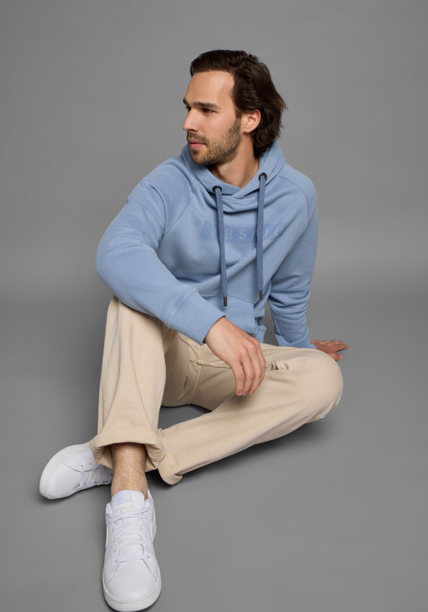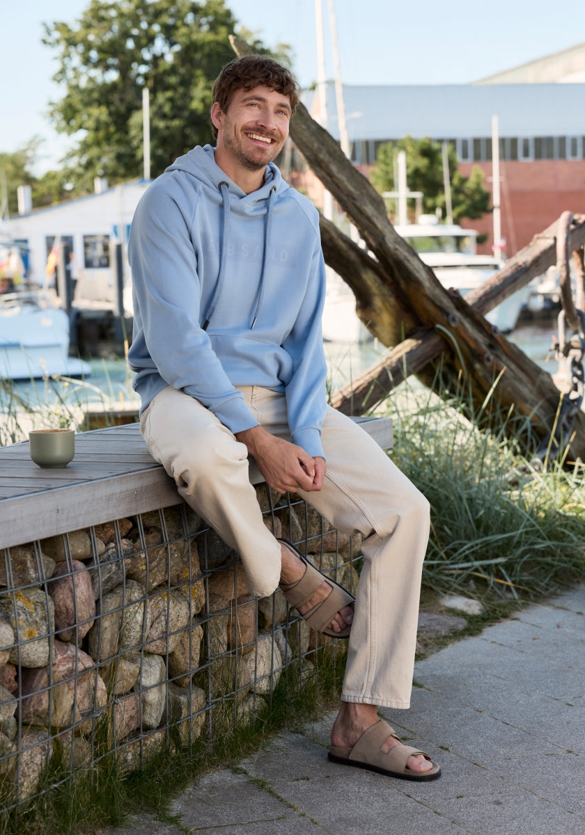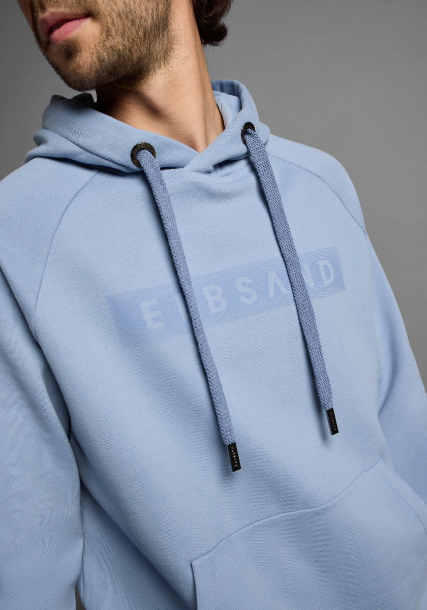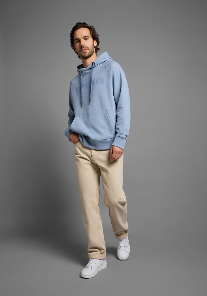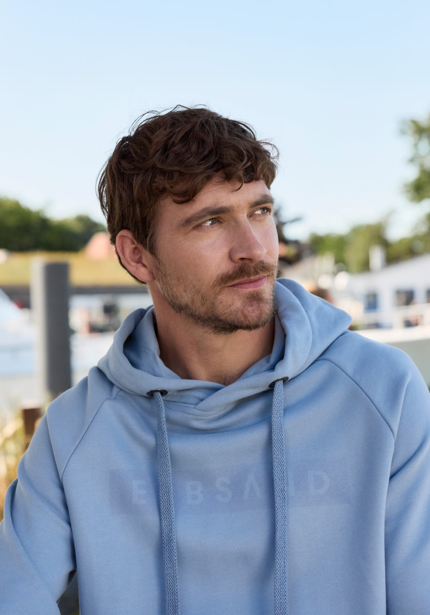 Our Elbsand Kiano Hoodie is a regular fit, loosely cut sweatshirt with a hood, offering soft and pleasantly heavyweight material. The roomy, double-layer hood with drawstring, tonal matching cords with branded metal ends, a kangaroo pocket, and elastic rib cuffs on sleeves and hem provide comfort and a good fit. A soft scribble-style print on the front gives the hoodie a unique look. Ideal for men seeking comfort, casual style, and high-quality craftsmanship – perfect for everyday wear, the gym, or relaxed weekends. Made from 100% cotton. Machine washable at 30°C on a gentle cycle, not suitable for tumble drying.
