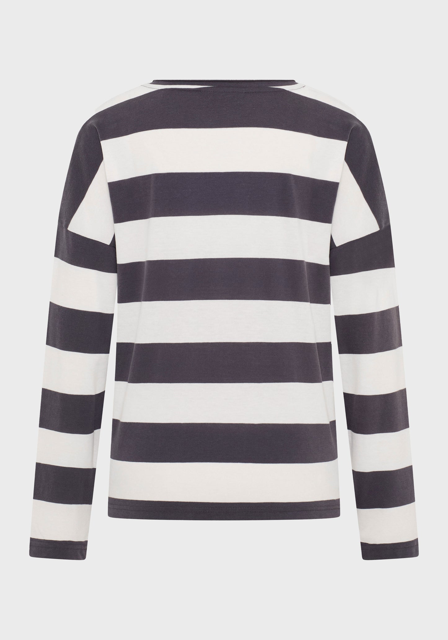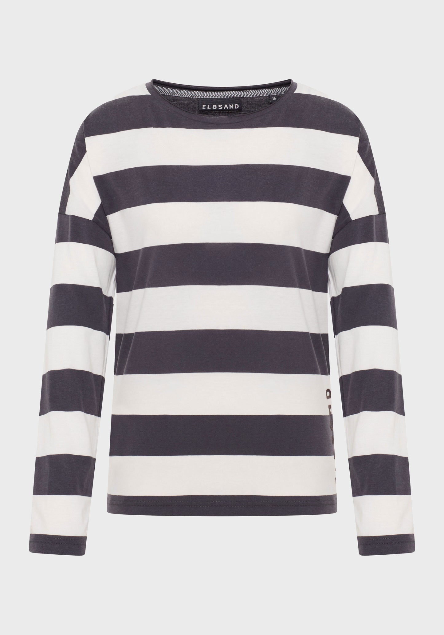 The Elbsand Milia Long Sleeve T-Shirt features a loose fit and is made from lightweight single jersey fabric with a trendy striped look and a soft feel. It has a boat neckline with an open rolled edge and a soft logo flock print on the front. This fashionable striped shirt comes in stylish color combinations, combining comfort with style. Made from 50% cotton and 50% polyester, it is designed for women and perfect for casual everyday wear. Care instructions: Machine wash at 30°C on a gentle cycle, do not tumble dry.