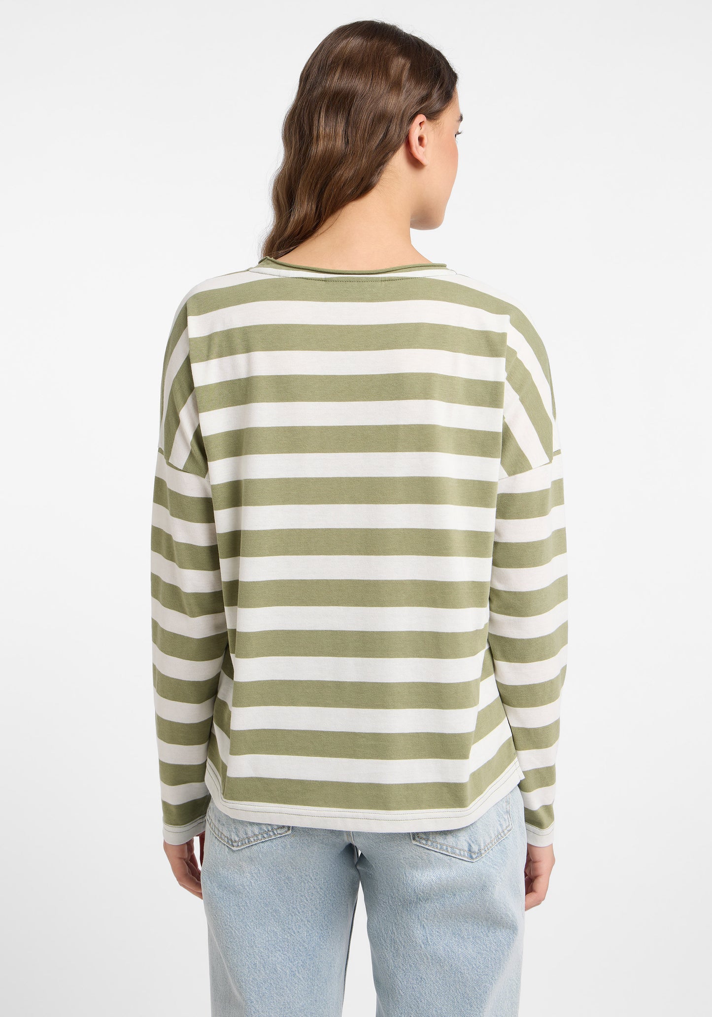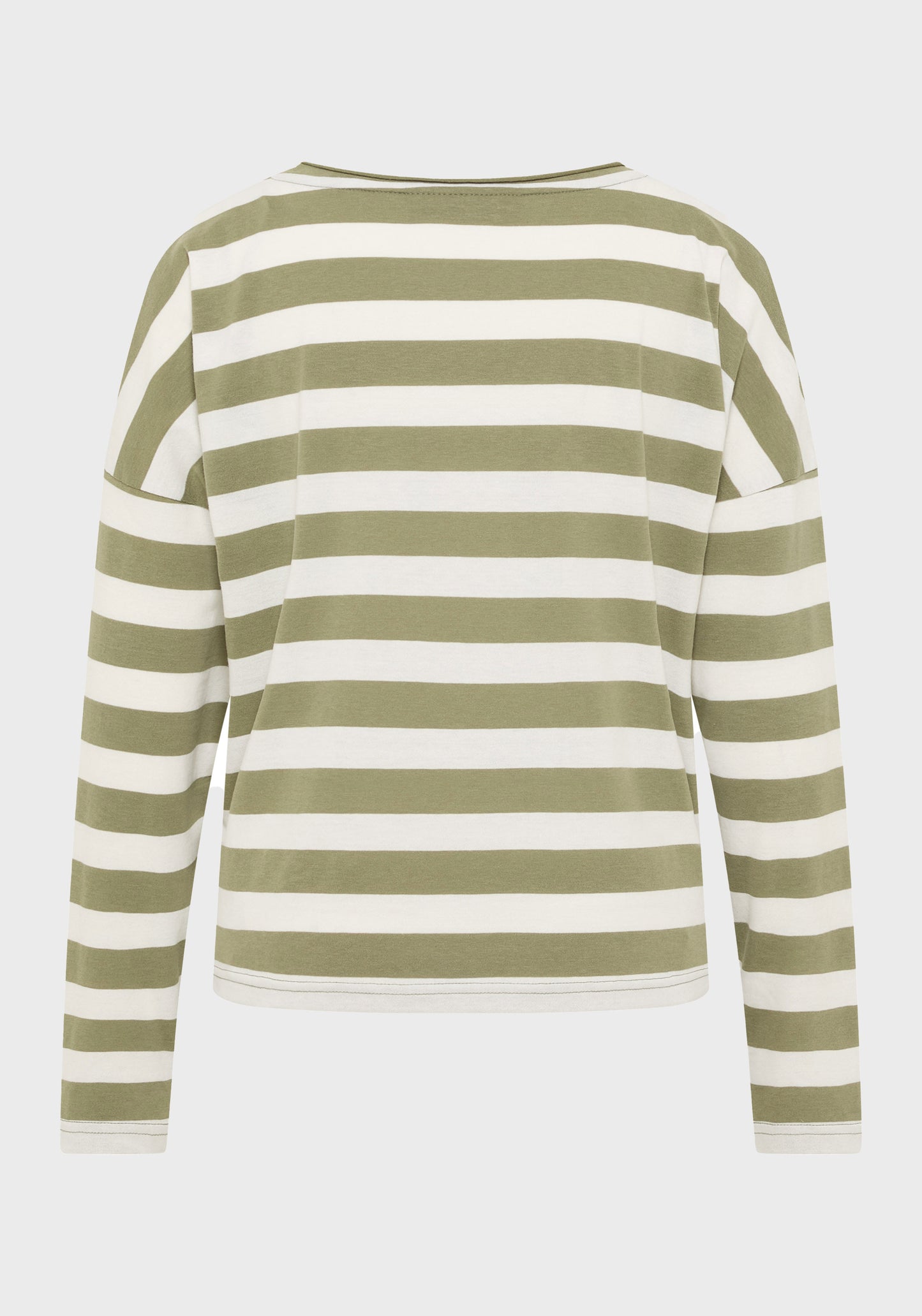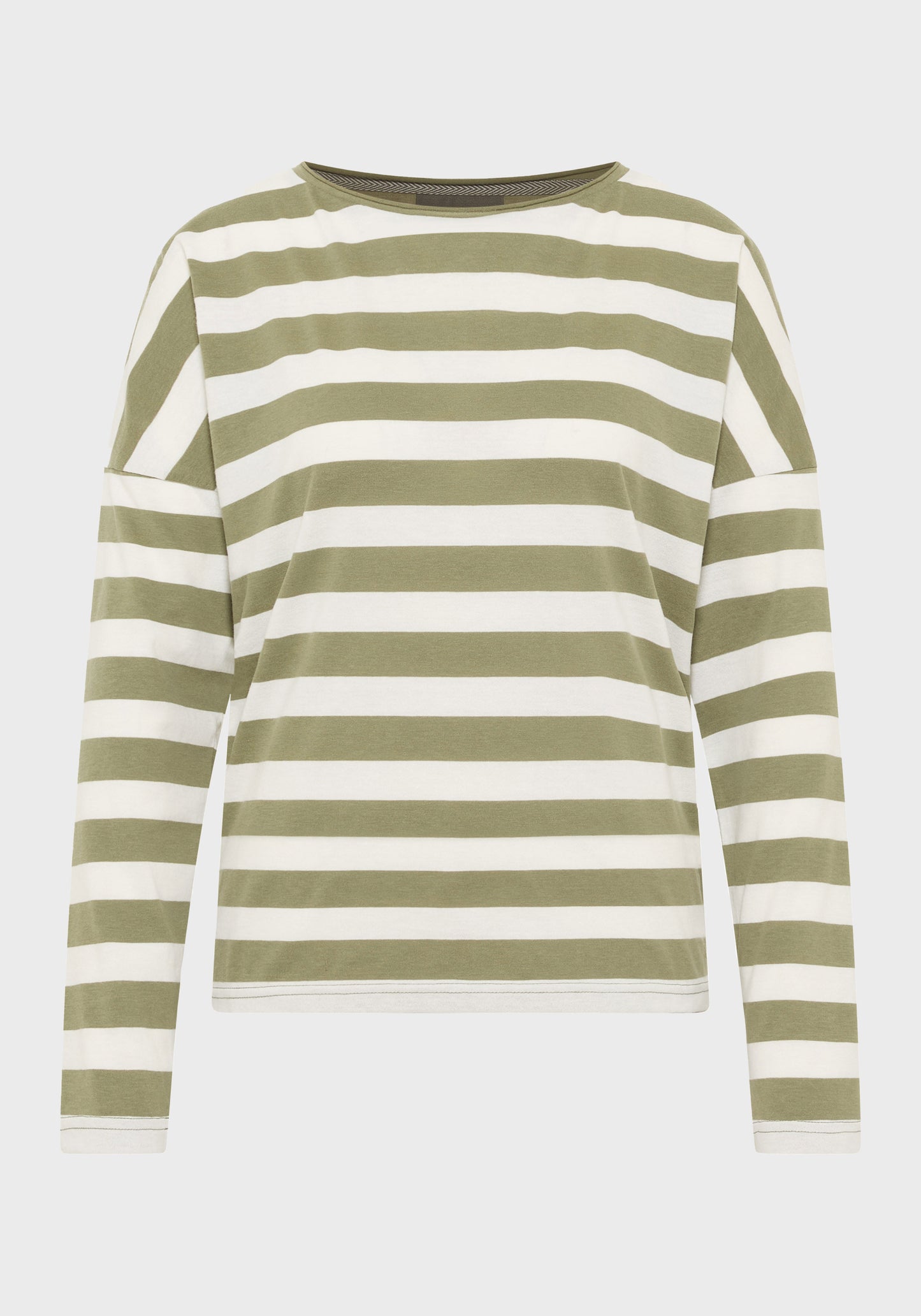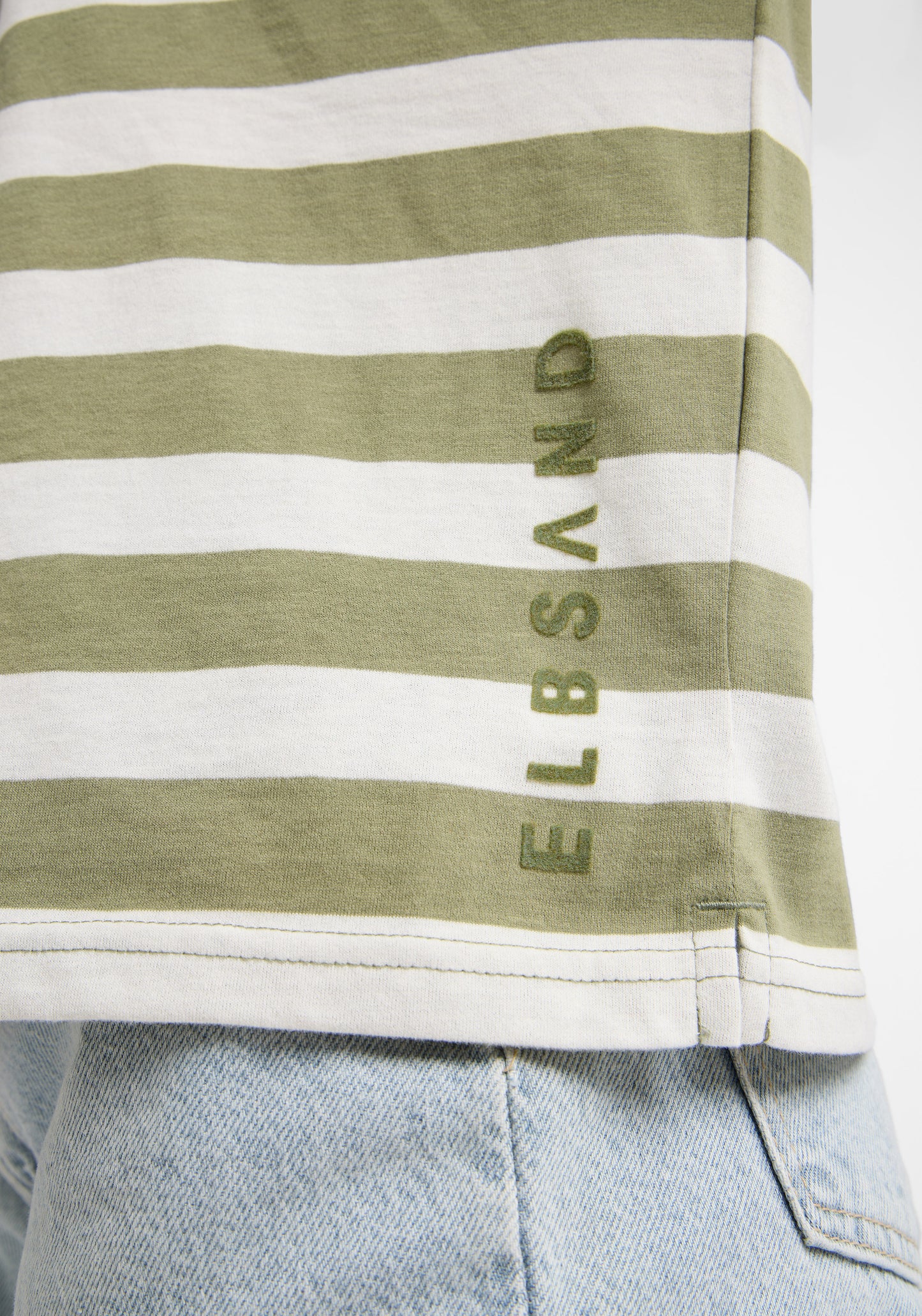 The Elbsand Milia Long Sleeve T-Shirt features a loose fit and is made from lightweight single jersey fabric with a trendy striped look and a soft feel. It has a boat neckline with an open rolled edge and a soft logo flock print on the front. This fashionable striped shirt comes in stylish color combinations, combining comfort with style. Made from 50% cotton and 50% polyester, it is designed for women and perfect for casual everyday wear. Care instructions: Machine wash at 30°C on a gentle cycle, do not tumble dry.