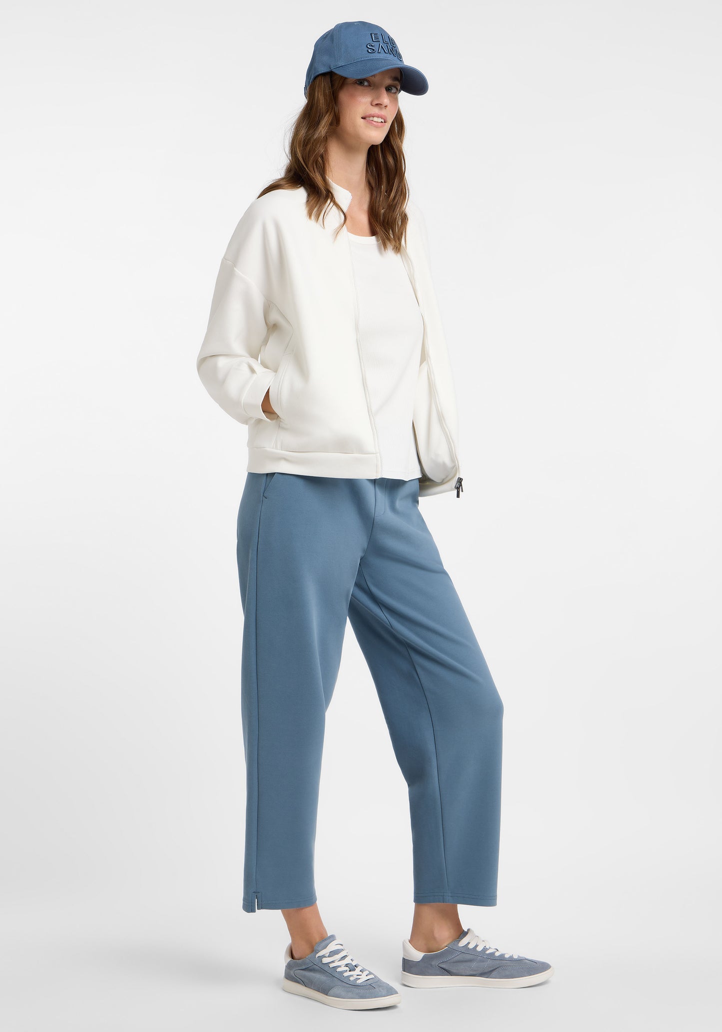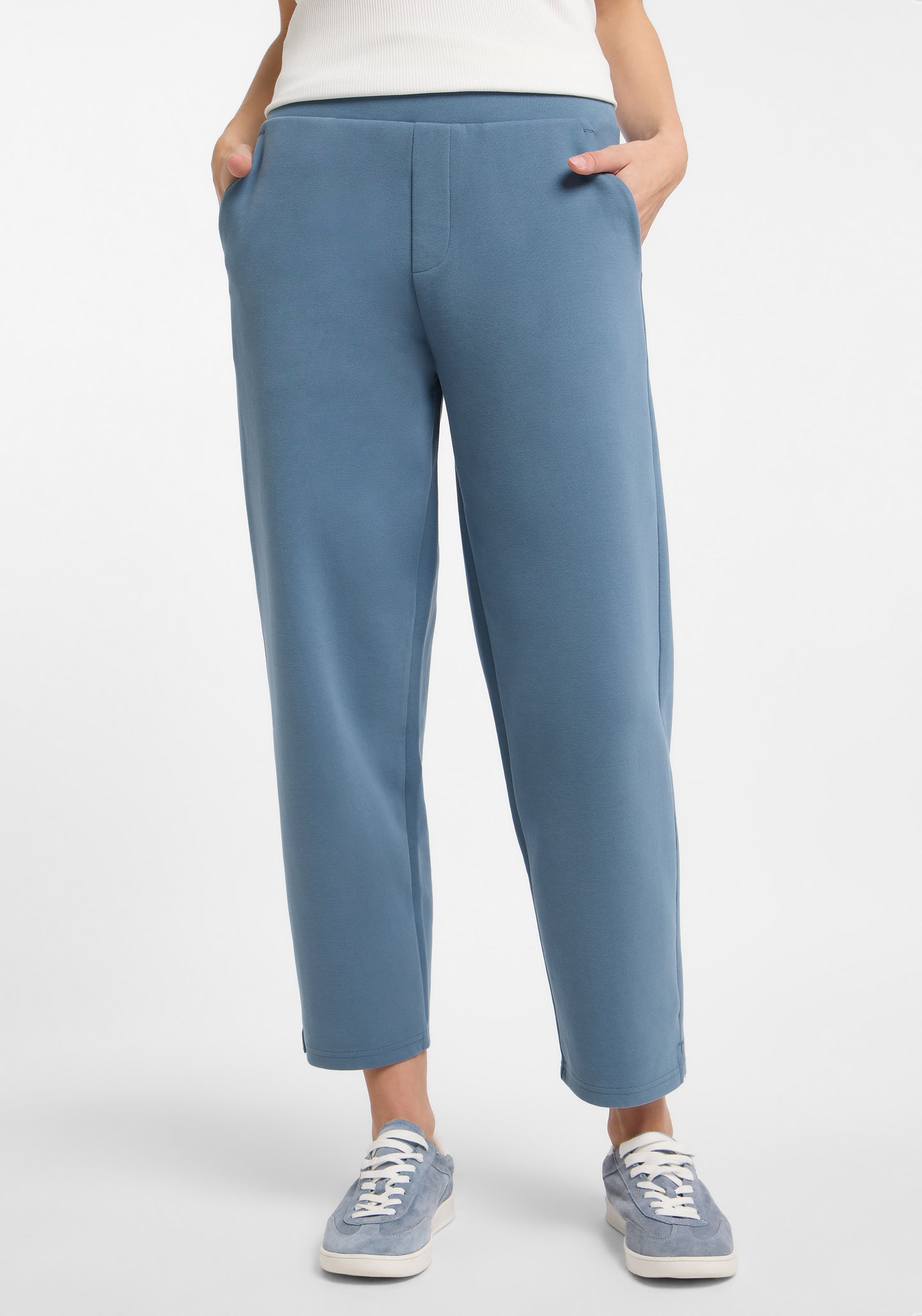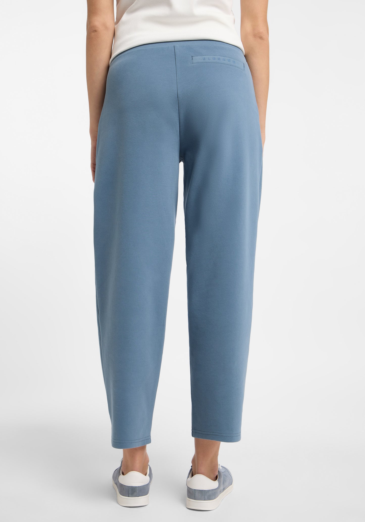 The Elbsand Piku Pants are ankle-length sweatpants for women featuring a trendy barrel-leg and relaxed fit. Made from soft interlock sweat fabric (82% cotton, 14% polyester, 4% elastane), they offer high wearing comfort. The waistband includes integrated elastic for a perfect fit. Practical front pockets and a discreet welt pocket at the back with a small rubber print complete the design. The clean premium look combines comfort and style, making these pants versatile for sporty and casual outfits.