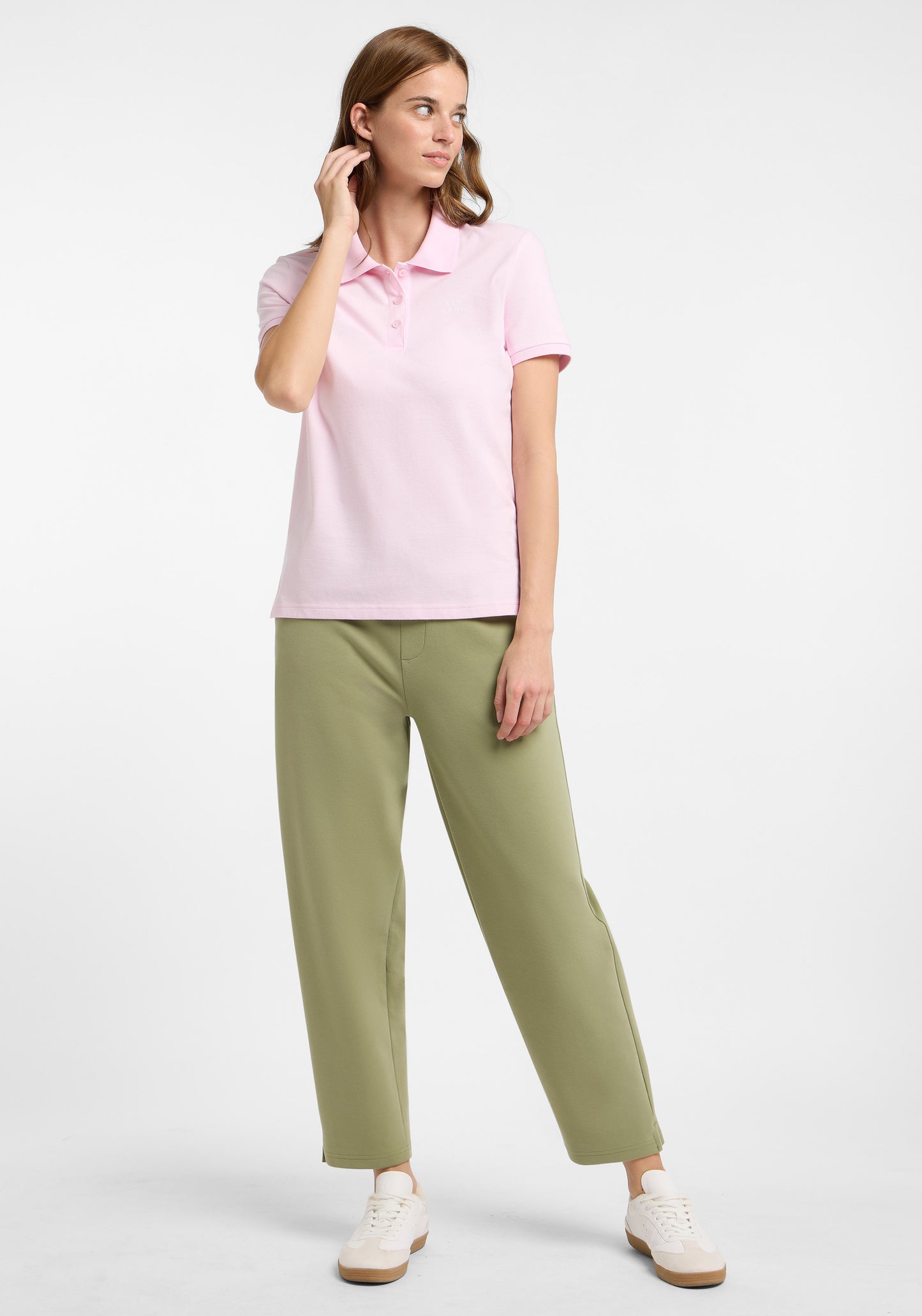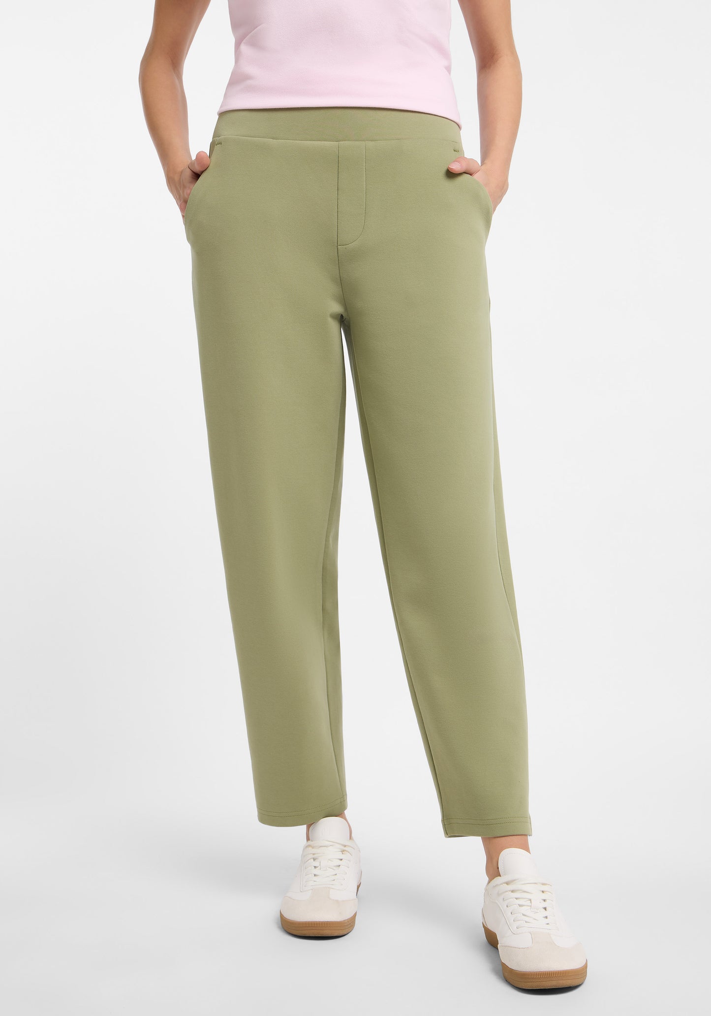 The Elbsand Piku Pants are ankle-length sweatpants for women featuring a trendy barrel-leg and relaxed fit. Made from soft interlock sweat fabric (82% cotton, 14% polyester, 4% elastane), they offer high wearing comfort. The waistband includes integrated elastic for a perfect fit. Practical front pockets and a discreet welt pocket at the back with a small rubber print complete the design. The clean premium look combines comfort and style, making these pants versatile for sporty and casual outfits.