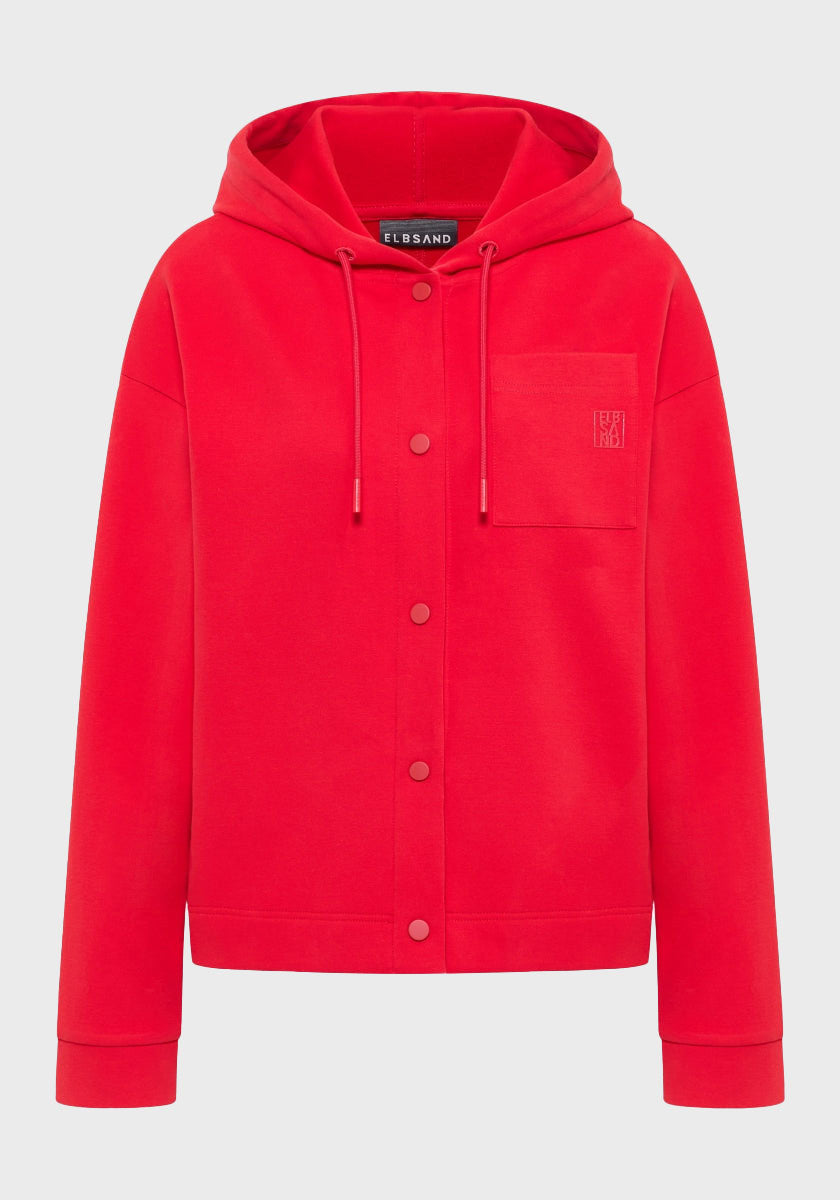 Our Elbsand Tarja Sweat Jacket features a loose fit with a hood made from soft interlock sweat fabric. The hood includes a drawstring with rounded, tonal-matched cords and branded cord ends. The jacket has dropped shoulders, side welt pockets, and a small patch chest pocket. A subtle, slightly glossy rubber print on the front adds a modern accent. This sweat jacket stands out with its cool layering style and modern, boxy silhouette, wearable as a jacket or overshirt. Perfect for a casual street style, cozy weekends, or the office routine. Composition: 82% organic cotton, 14% polyester, 4% elastane. Care instructions: Machine wash at 30°C gentle cycle, not suitable for tumble drying.