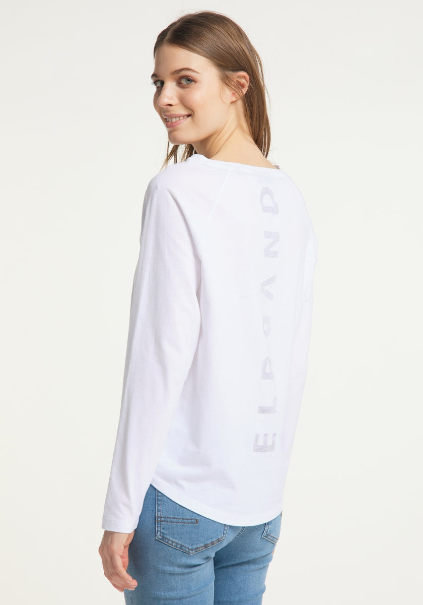 Our Elbsand Tinna Long Sleeve T-Shirt features a loose fit and is made from lightweight single jersey fabric with a soft touch. This stylish basic long sleeve top has a fashionable boat neckline and a rounded hem. On the back, there is a soft, semi-transparent print that adds a subtle highlight. The T-shirt offers a super soft wearing experience and is versatile to combine, perfect for everyday wear, city strolls, or relaxing. Composition: 50% cotton, 50% polyester. Care instructions: Machine wash at 30 degrees on a gentle cycle, not suitable for tumble drying. Elbsand stands for relaxed, authentic style and comfort, ideal for women seeking a cozy yet stylish basic long sleeve shirt.