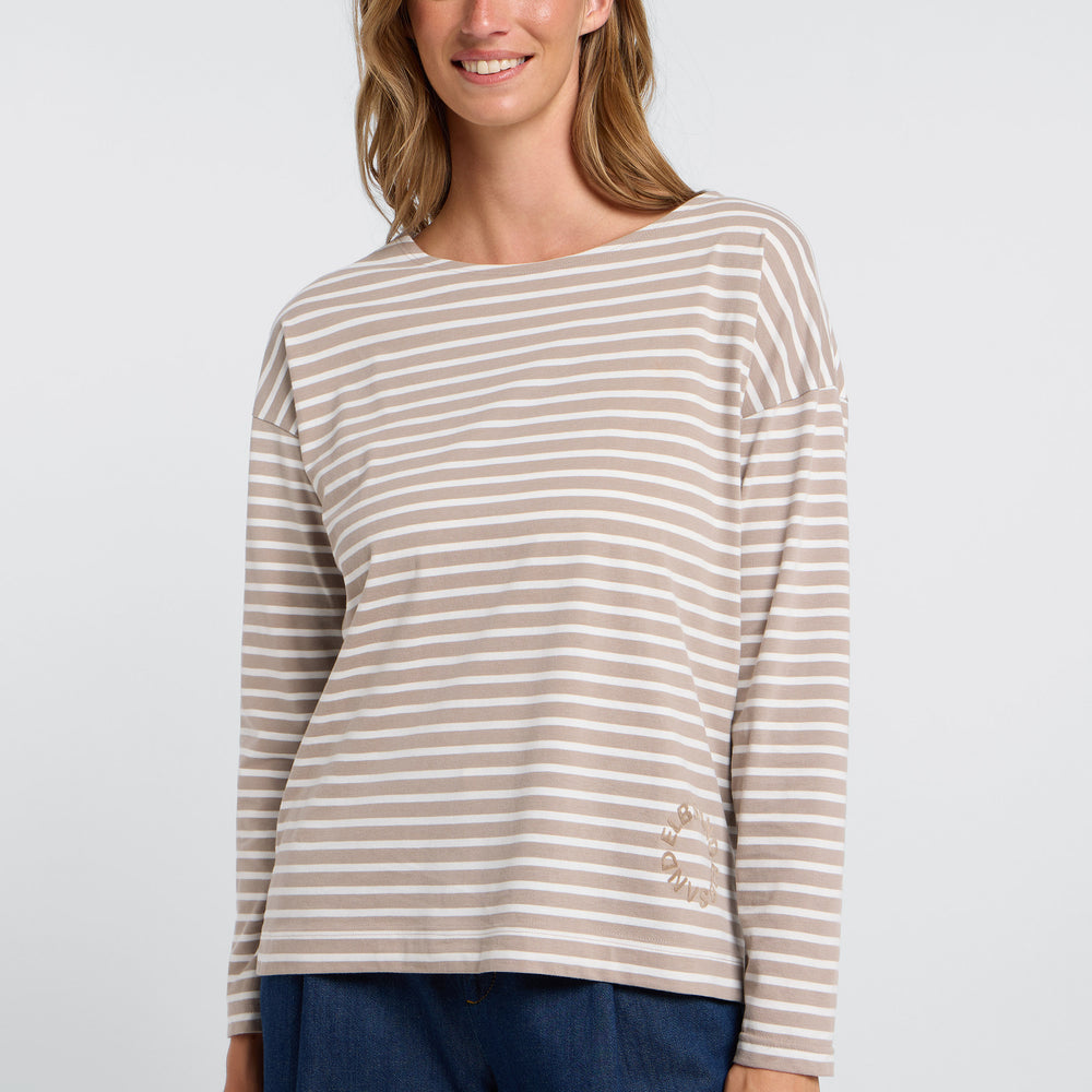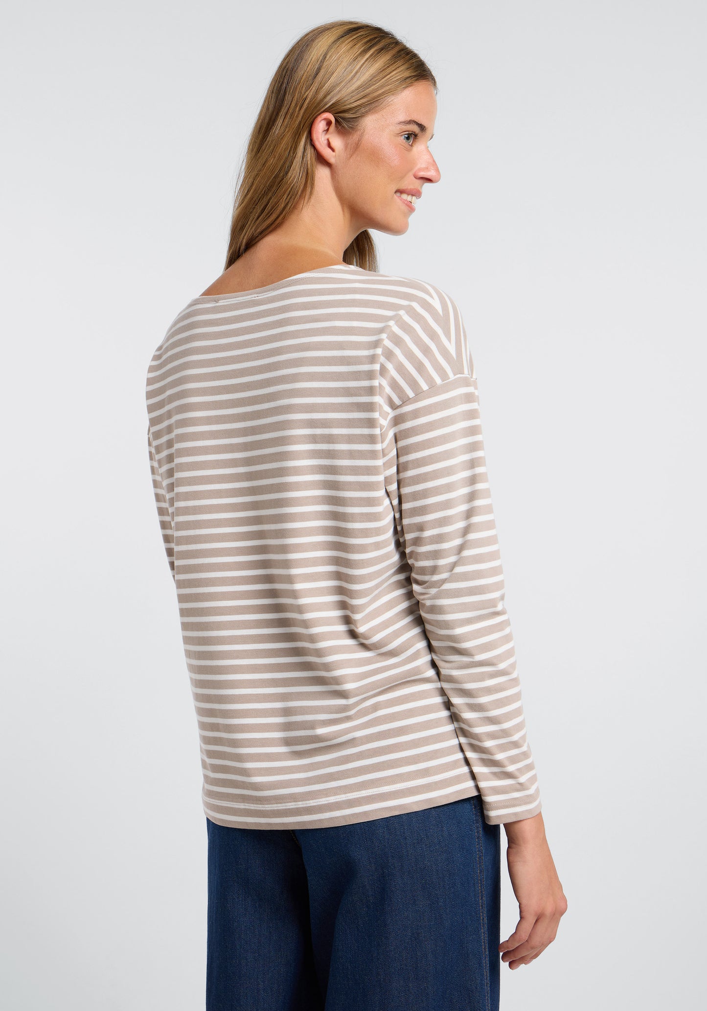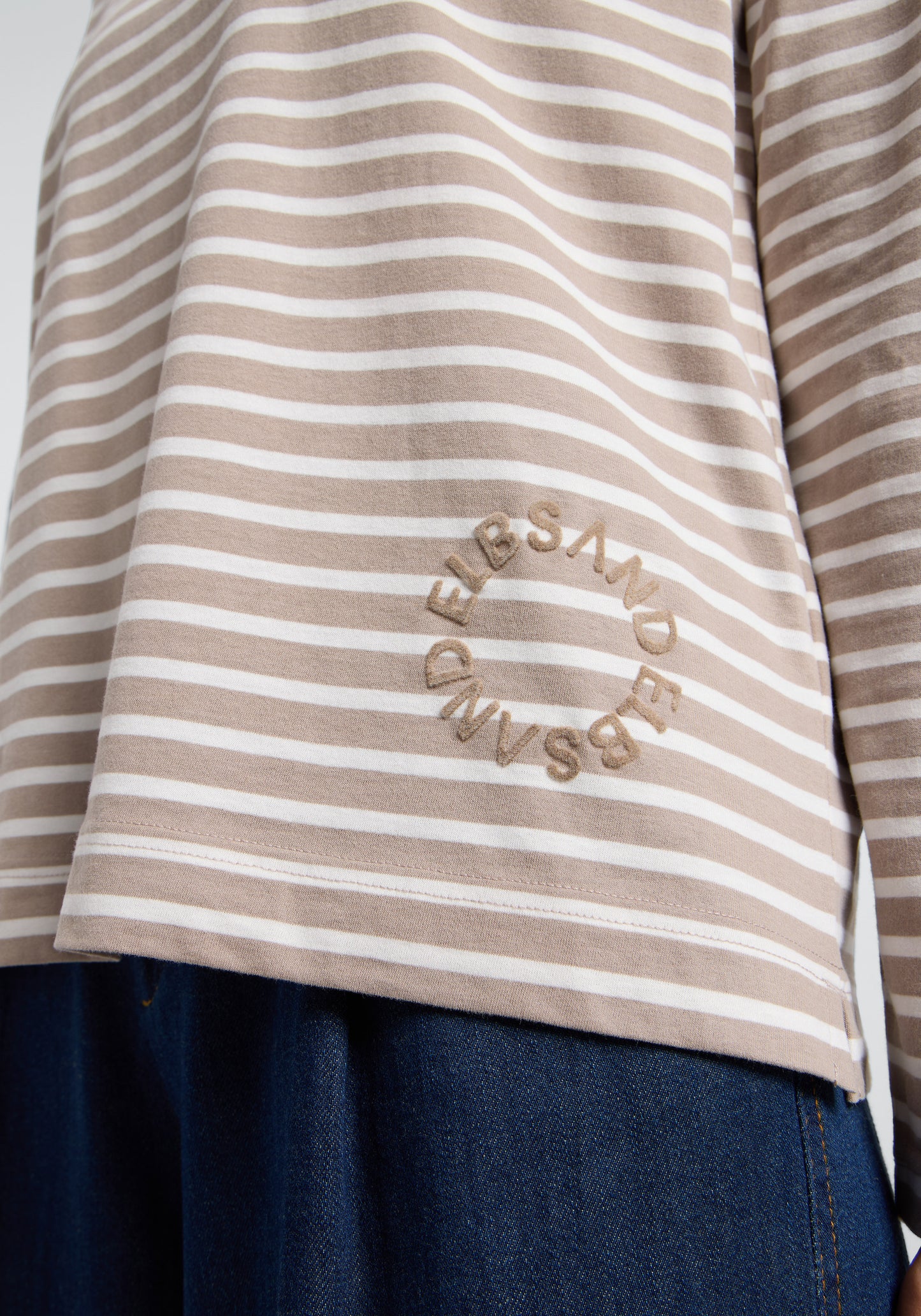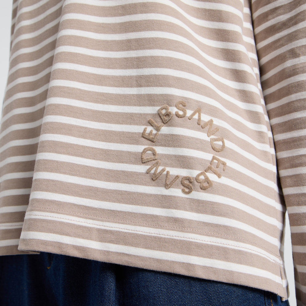 The boat neckline adds a feminine touch to the look and pairs perfectly with necklaces or scarves. A soft flock print on the front adds subtle accents that highlight the signature Elbsand style. Whether worn with jeans, shorts, or jog pants – this striped long sleeve always works.