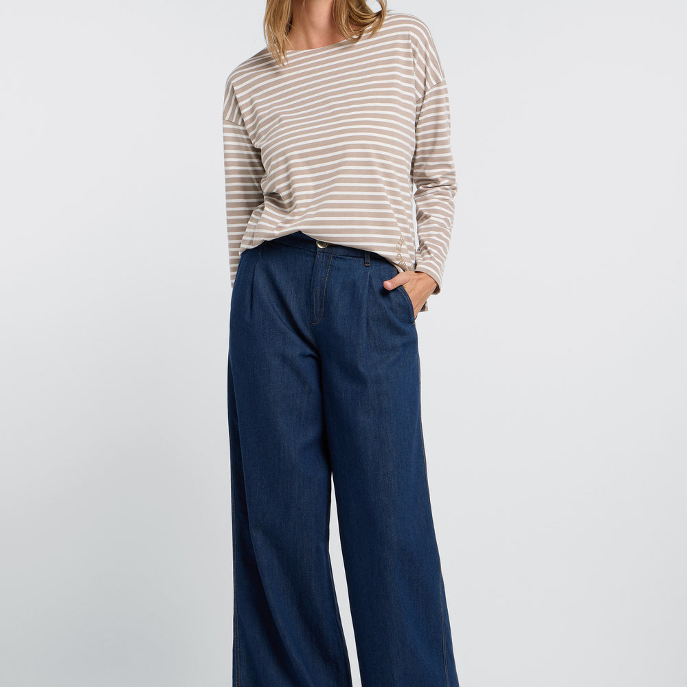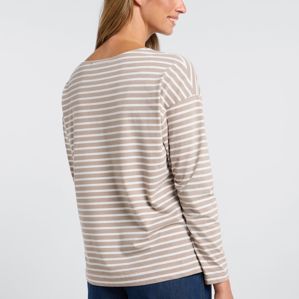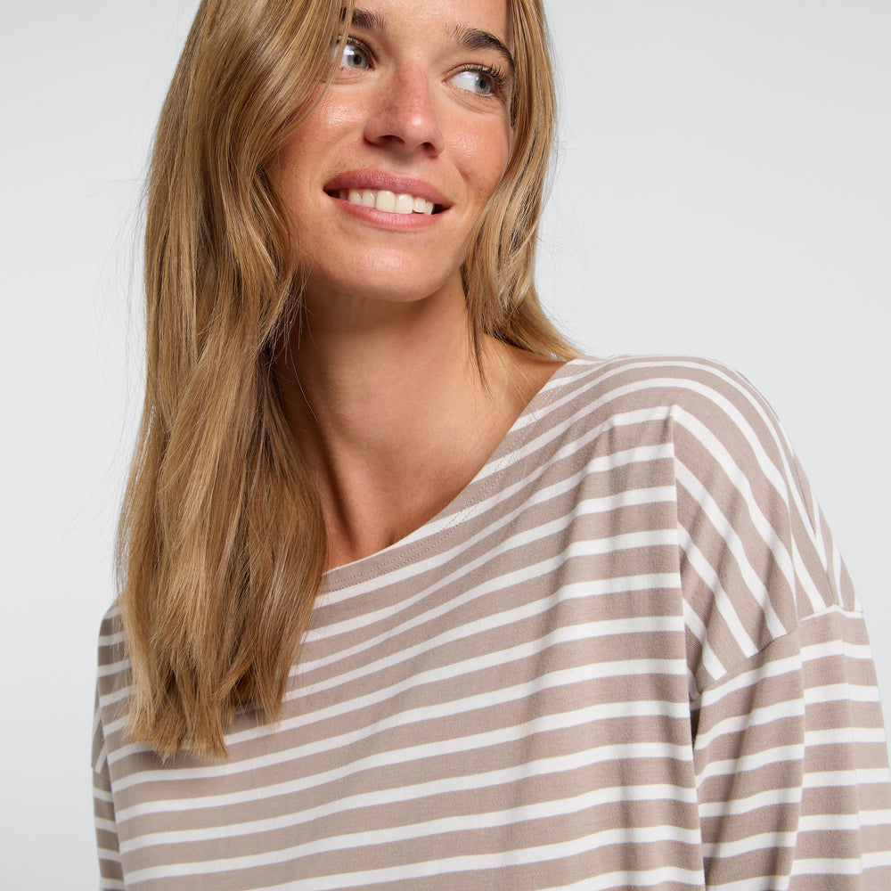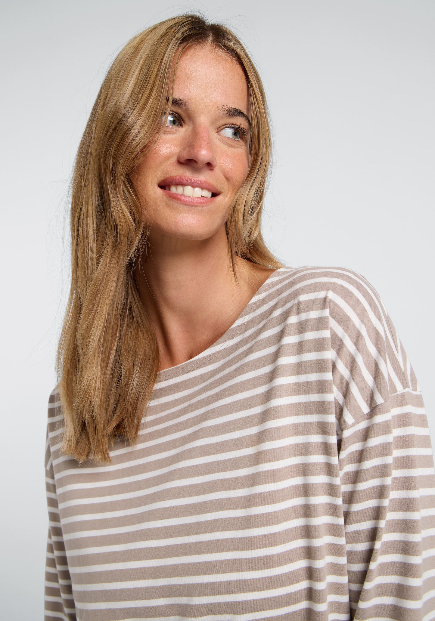 The boat neckline adds a feminine touch to the look and pairs perfectly with necklaces or scarves. A soft flock print on the front adds subtle accents that highlight the signature Elbsand style. Whether worn with jeans, shorts, or jog pants – this striped long sleeve always works.